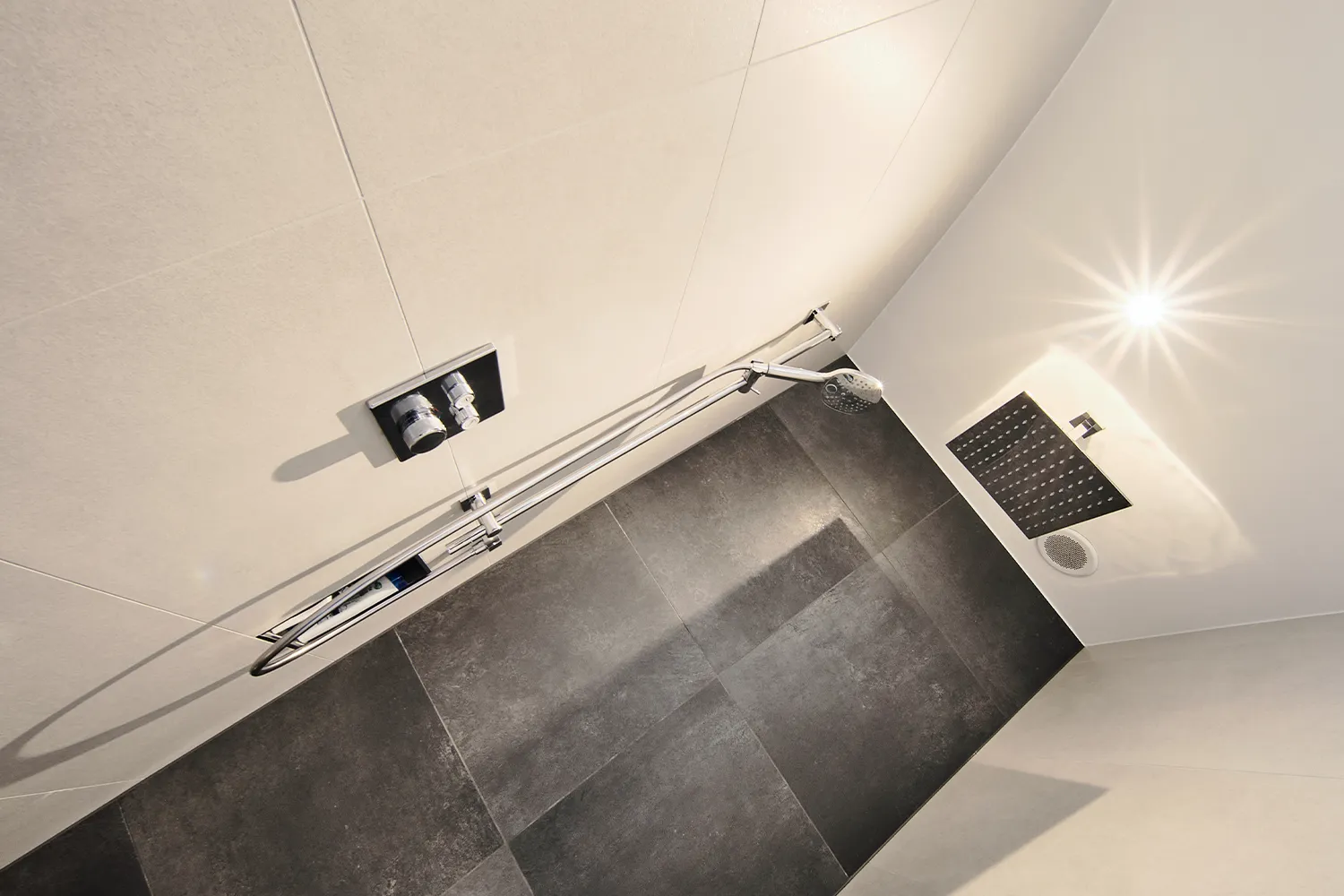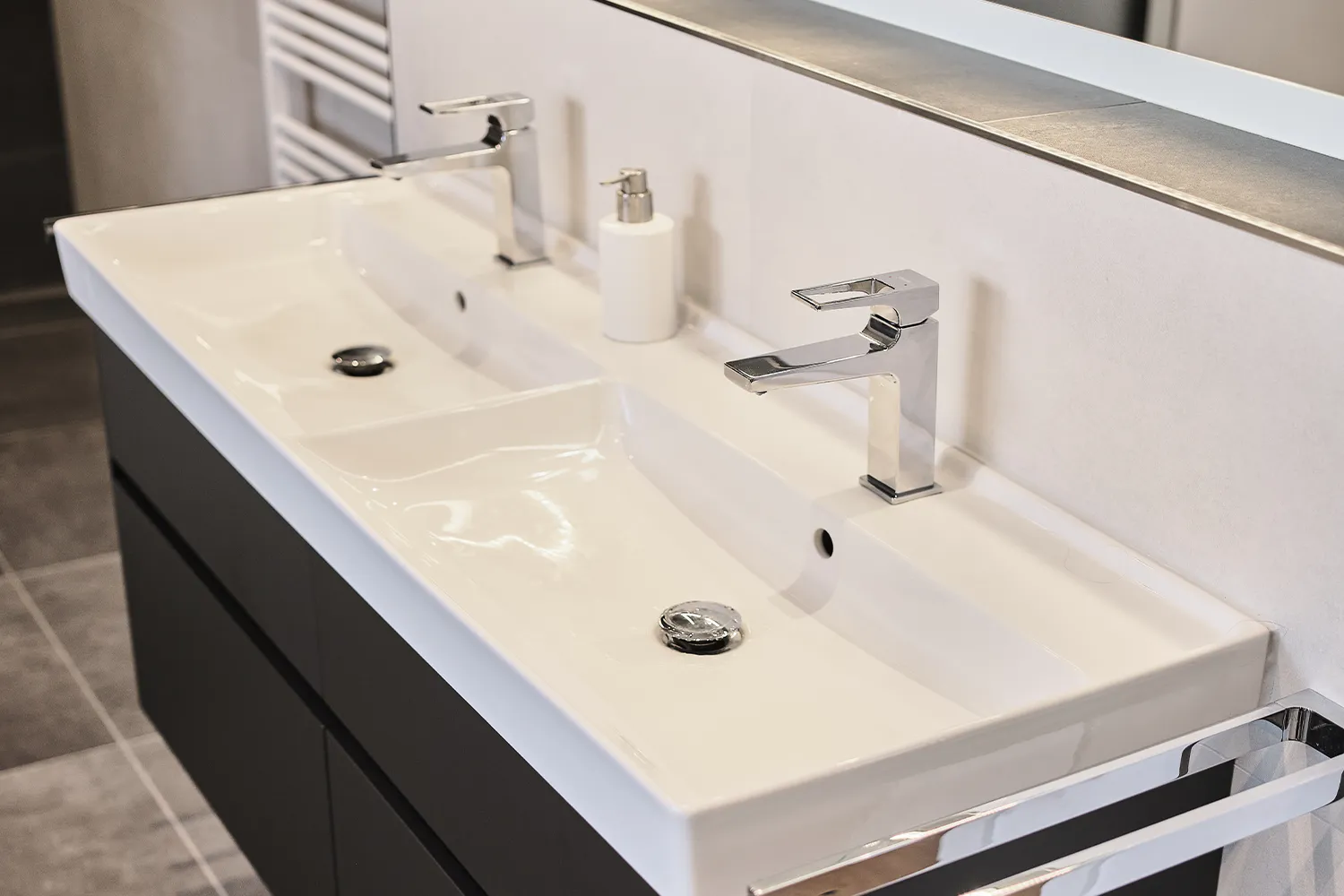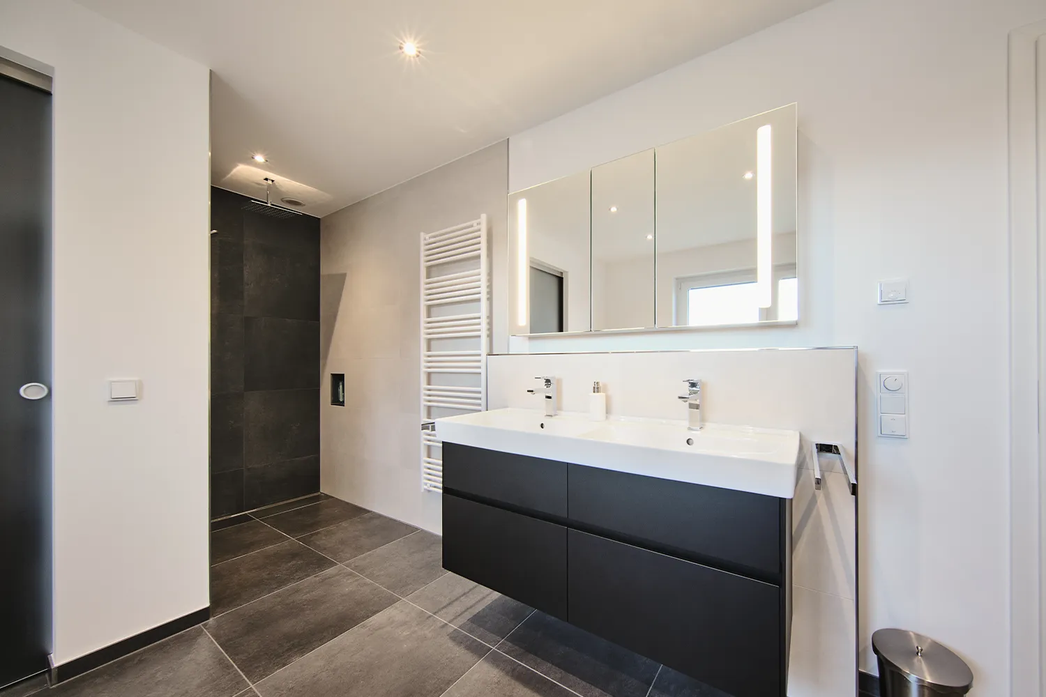 Das Badezimmer ist auf eine klare, neutrale und zeitlose Gestaltung ausgerichtet, die durch die Verwendung von Weiß-, Grau und Anthrazittönen erzielt wird. Durch eine raffinierte Dekoration und die Verwendung von Accessoires kann der Raum individuell gestaltet werden und erhält dadurch eine persönliche Note.