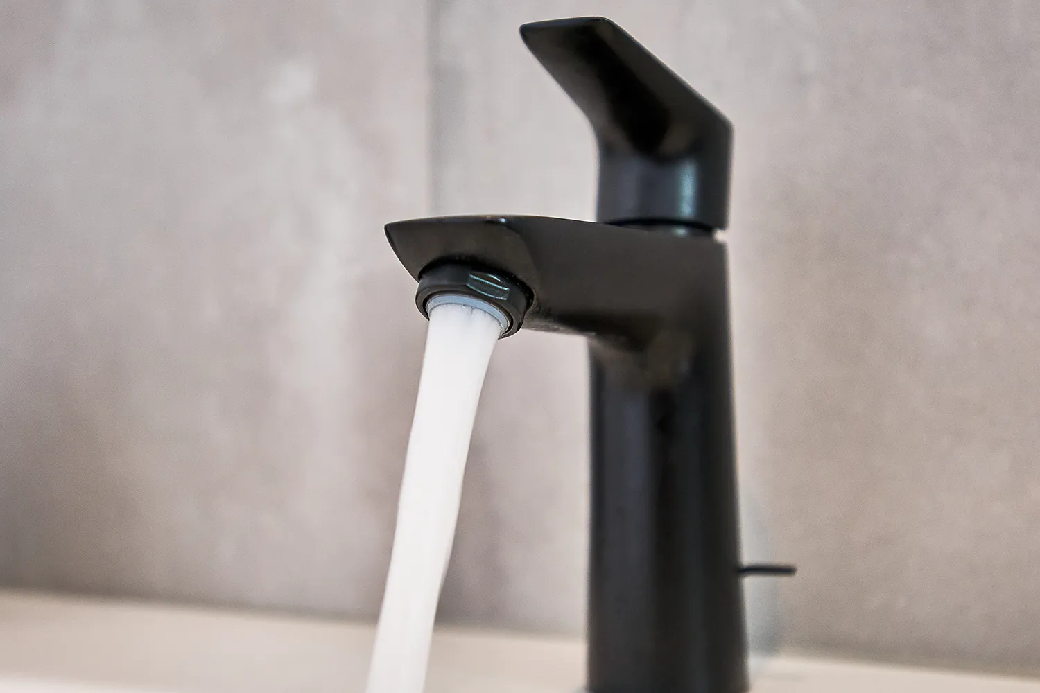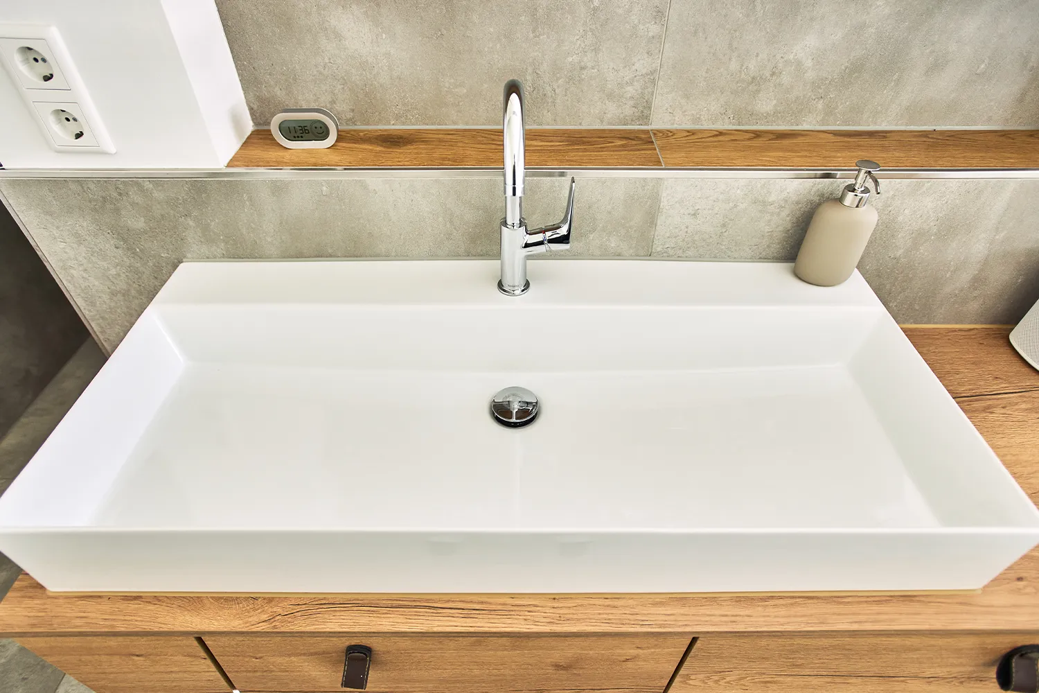 Der Waschtisch-Unterschrank mit leicht asymmetrischer Holz-Front und geschickter Beleuchtung verleiht dem Badezimmer eine einzigartige Atmosphäre. Schwarze Armaturen sorgen für eine moderne und elegante Optik.