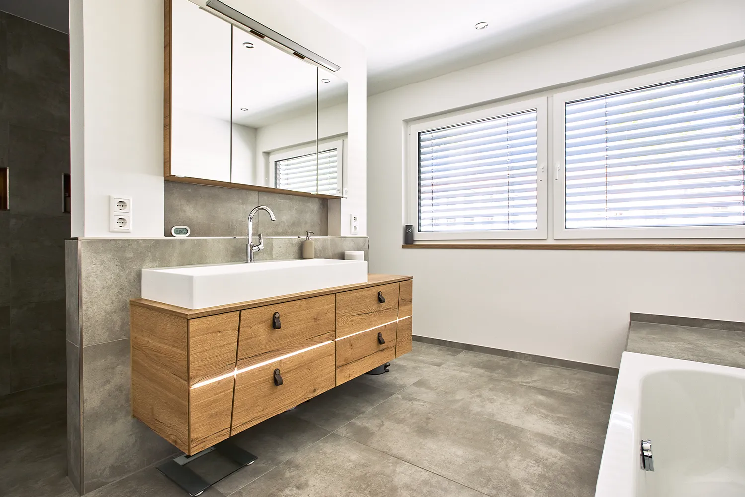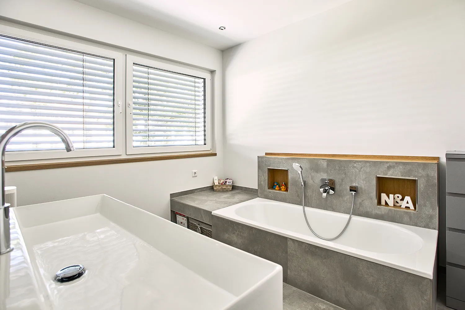 Das exklusive Badezimmer wurde in enger Zusammenarbeit mit den Bauherren konzipiert. Jedes Detail wurde nach ihren individuellen Bedürfnissen geplant. Die Badewanne wurde mit großformatigen Fliesen – identisch zu den Bodenfliesen – verkleidet und bietet mit hölzernen Wandnischen eine stilvolle Ergänzung für Accessoires und Dekorationen.