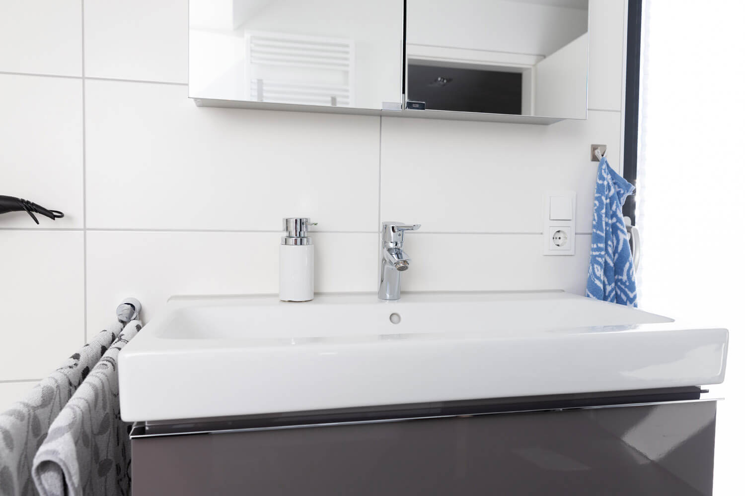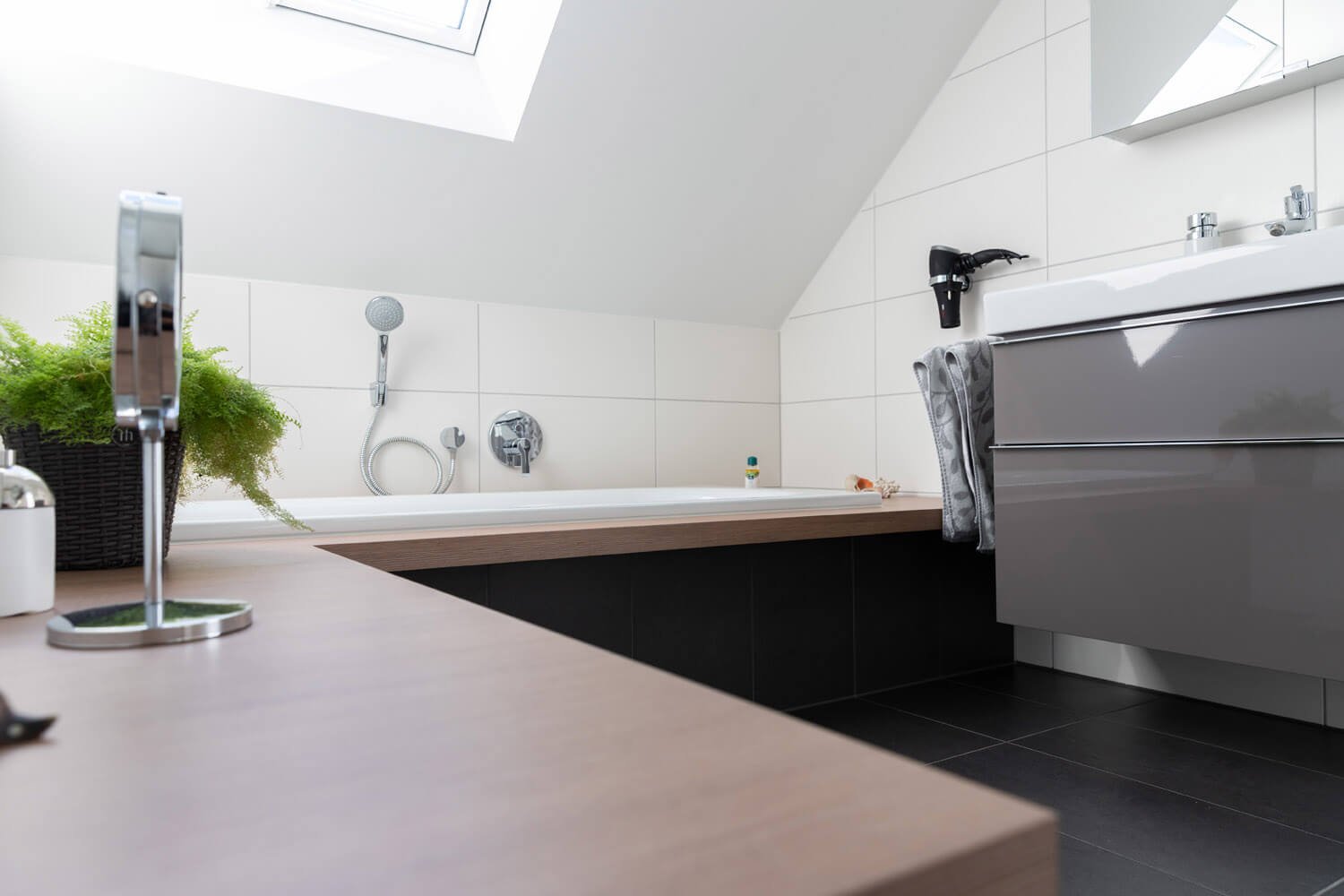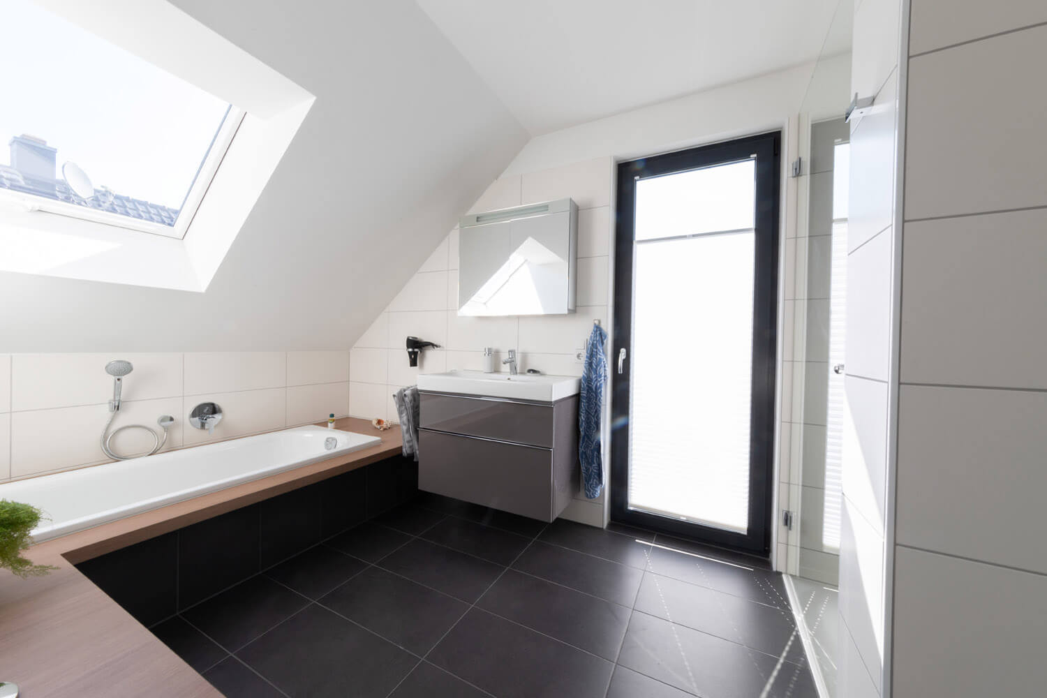 Funktionalität und Ästhetik gehen Hand in Hand. Das Bad ist ebenerdig, daher leicht zu reinigen. Durch die Lüftungsanlage entstehen keine Dämpfe, das Fenster muss nicht geöffnet werden, was natürlich besonders im Winter sehr angenehm ist.