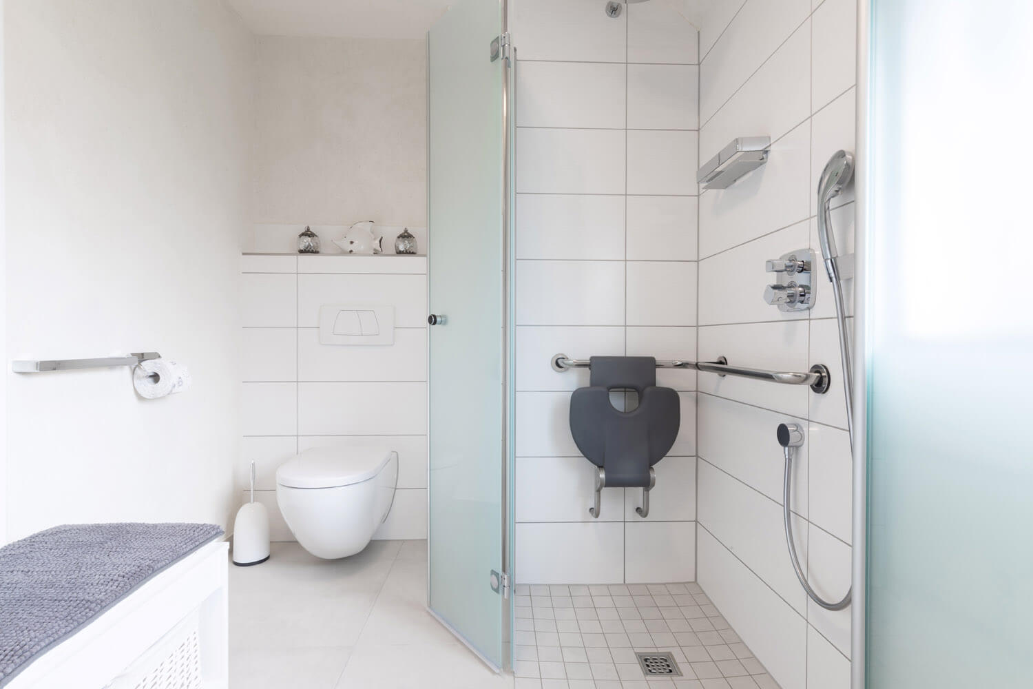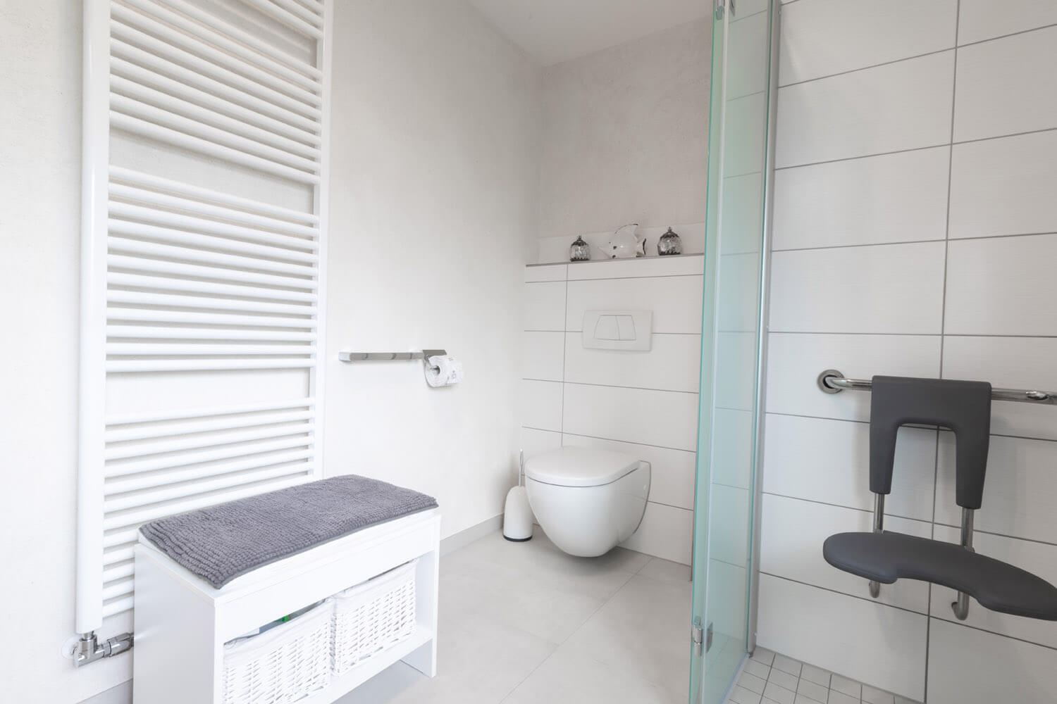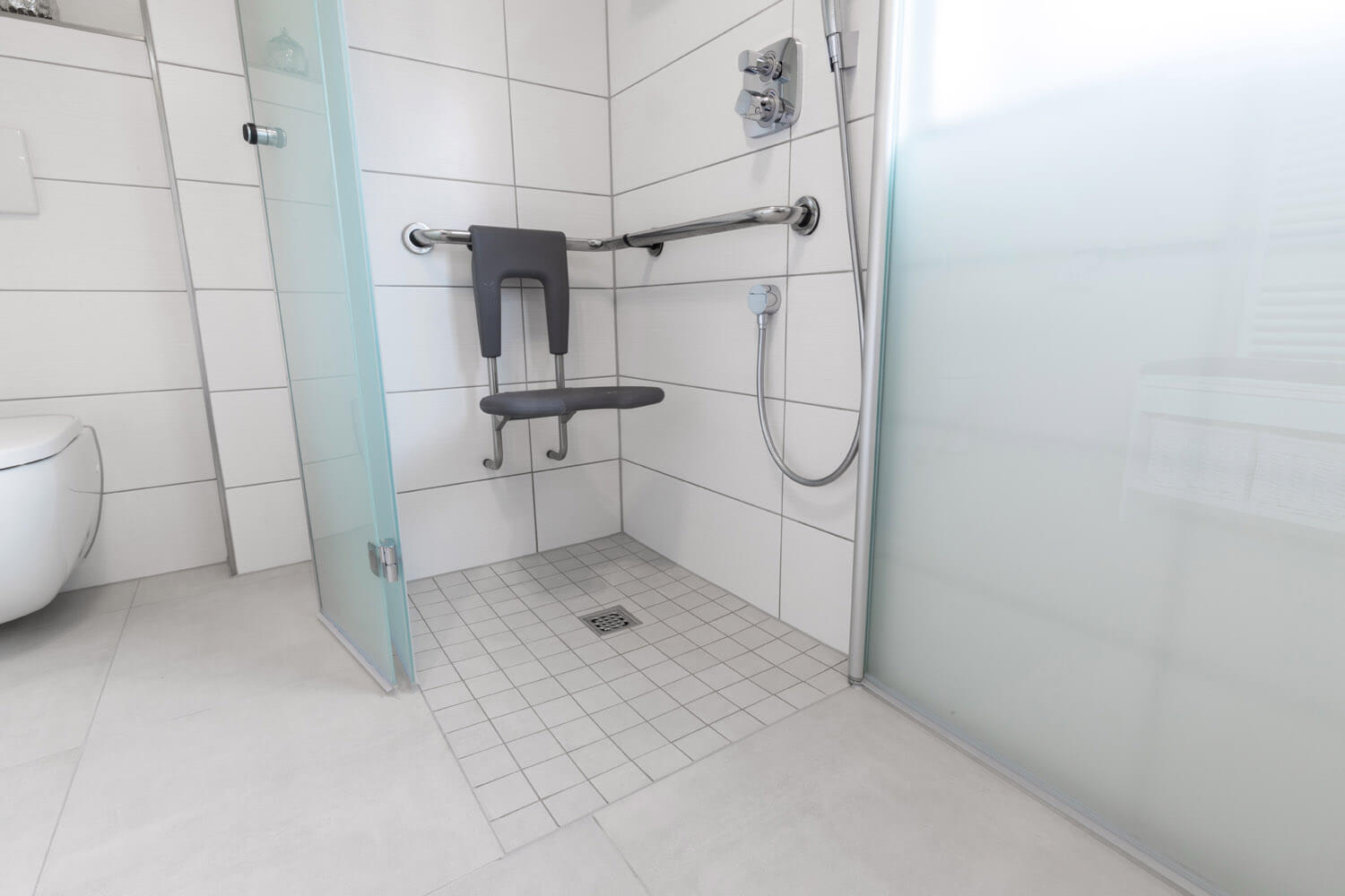 In diesem Reihenhaus wurde das Bad teilsaniert und komplett barrierefrei umgebaut. Die ebenerdige Dusche erleichtert den Zugang und die Reinigung erheblich. Das Bad ist trotz kleinen Platzverhältnissen zur Pflege von Menschen geeignet.