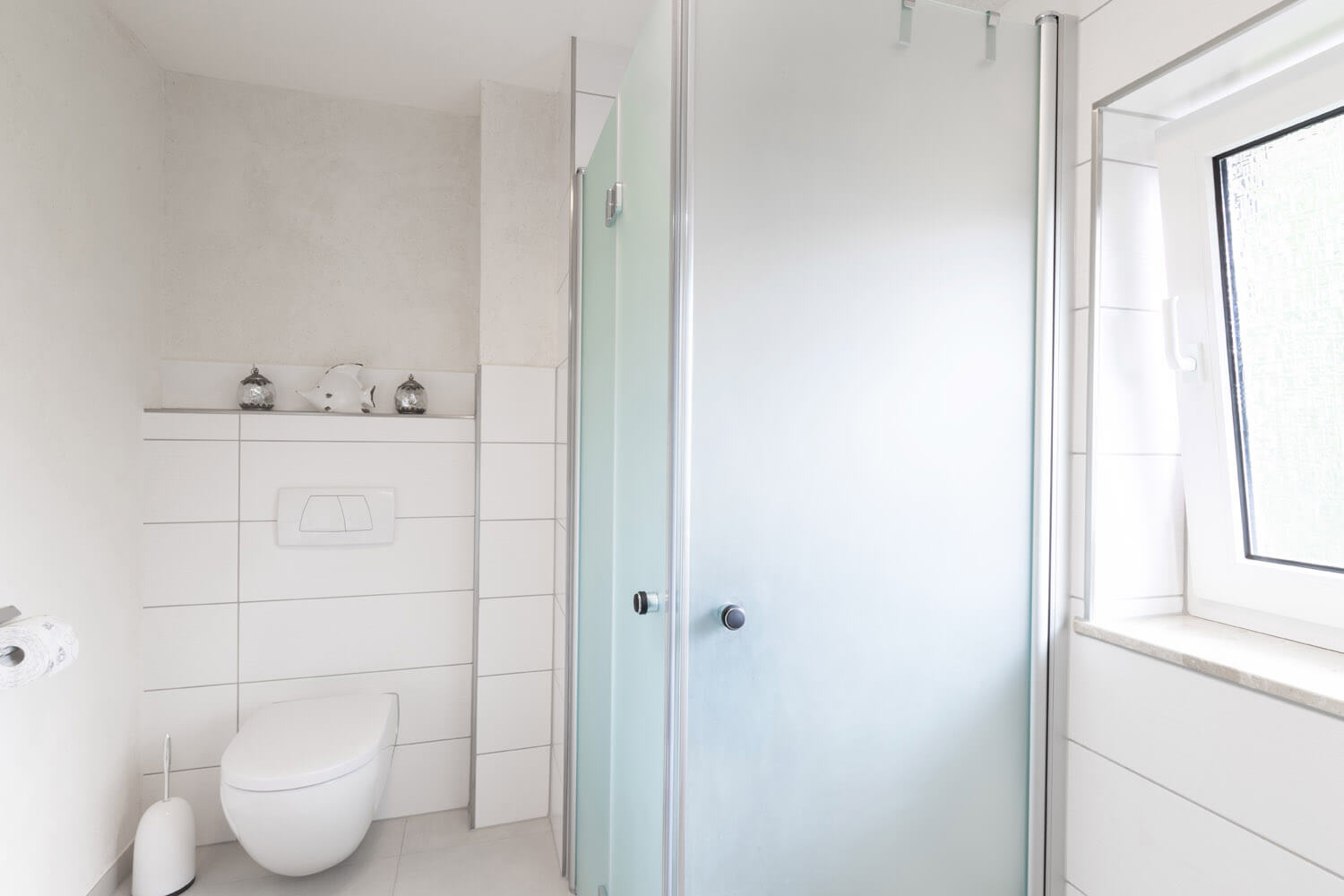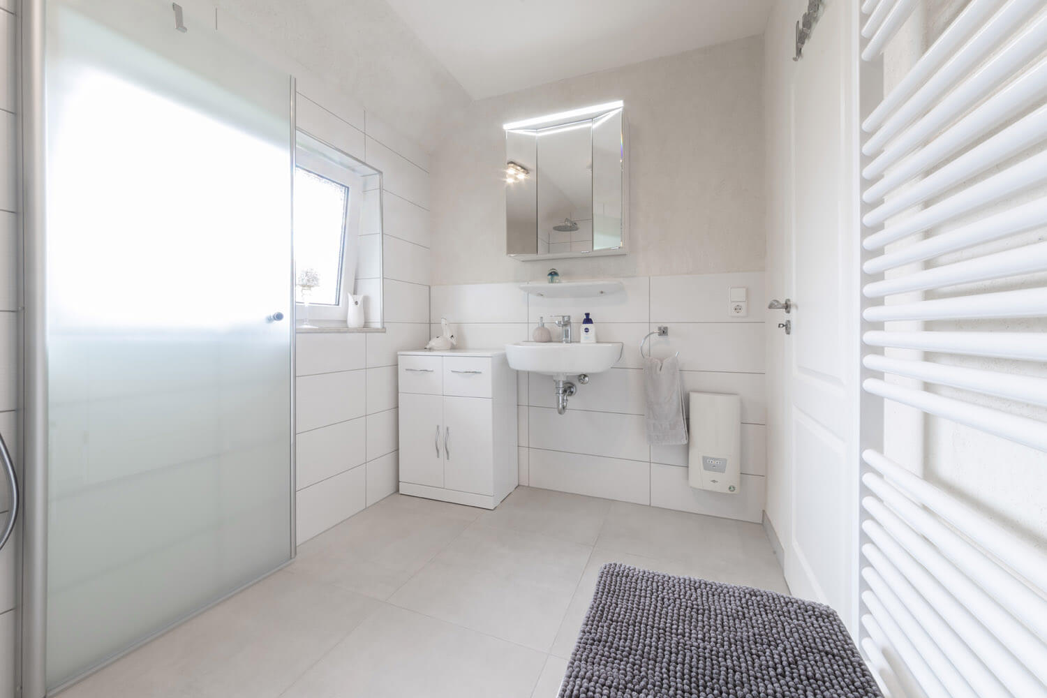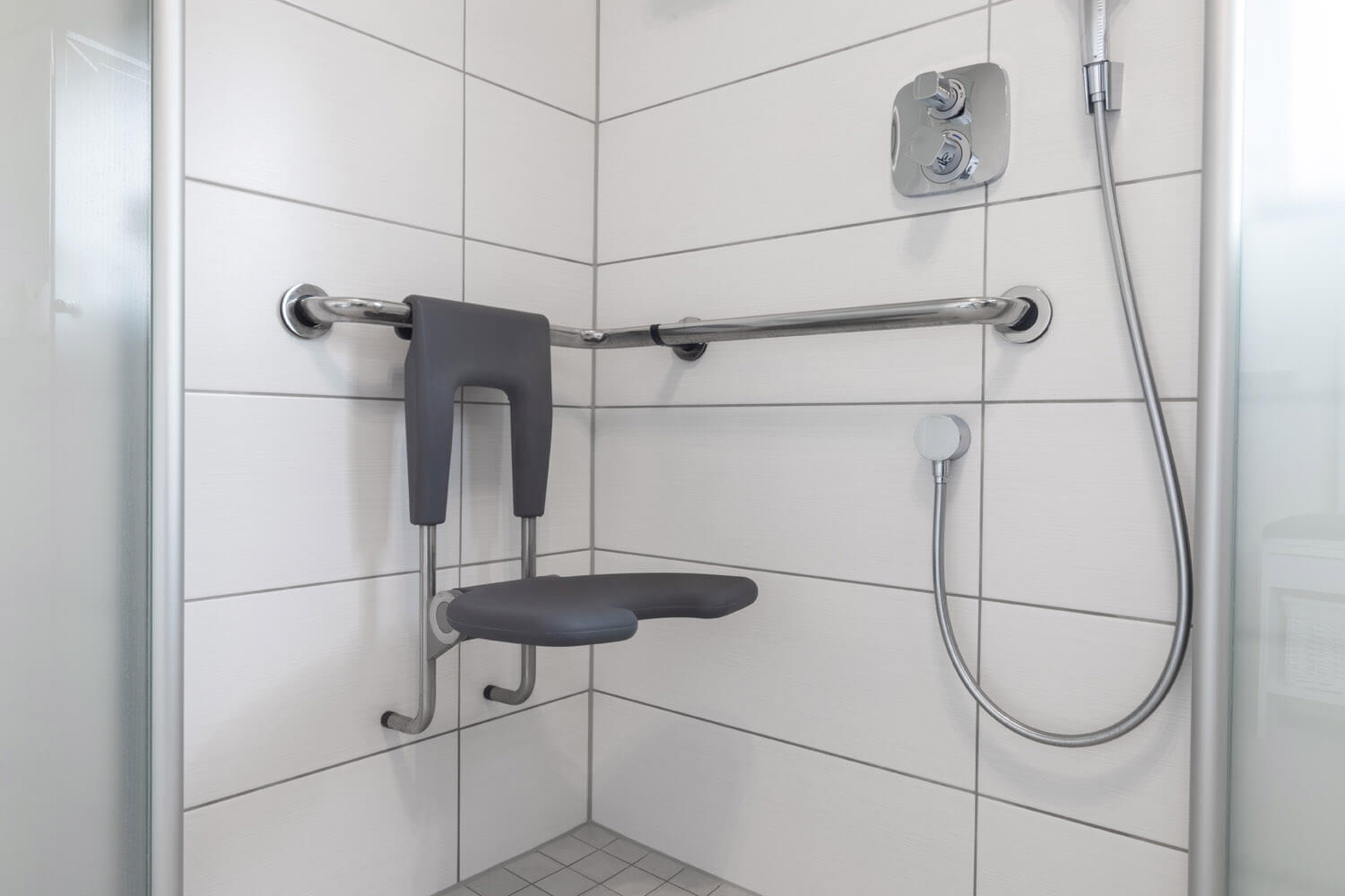 In diesem Reihenhaus wurde das Bad teilsaniert und komplett barrierefrei umgebaut. Die ebenerdige Dusche erleichtert den Zugang und die Reinigung erheblich. Das Bad ist trotz kleinen Platzverhältnissen zur Pflege von Menschen geeignet.