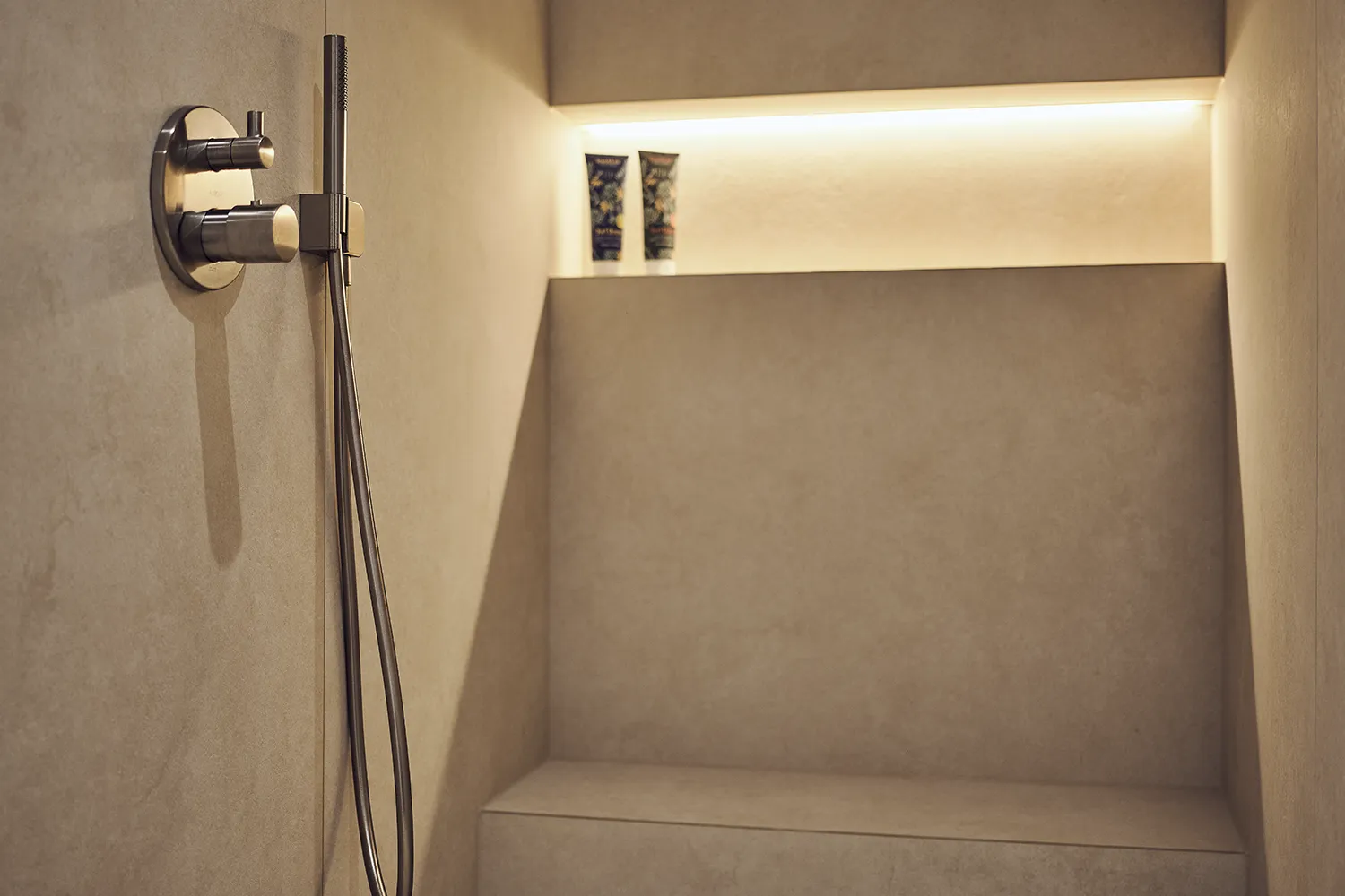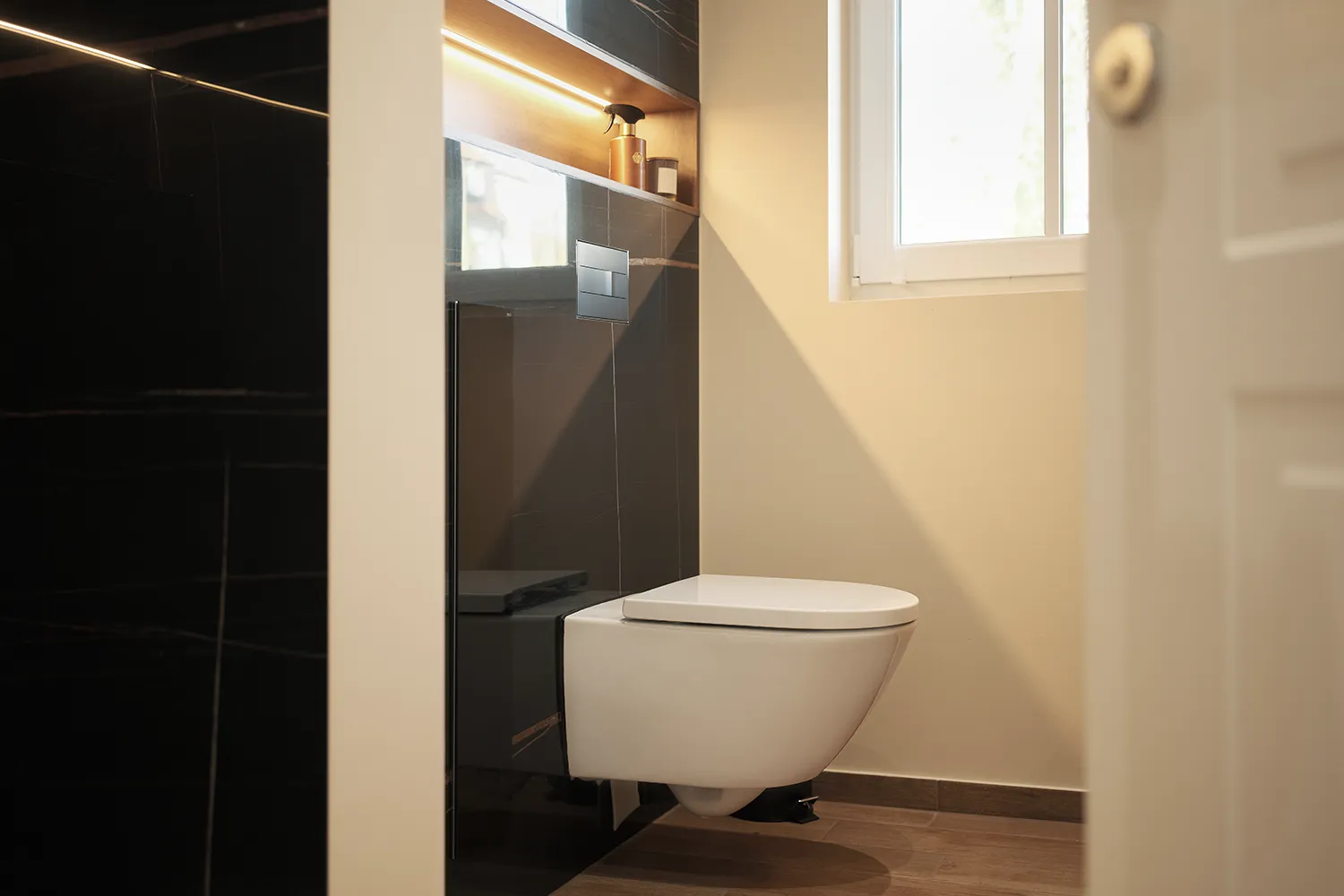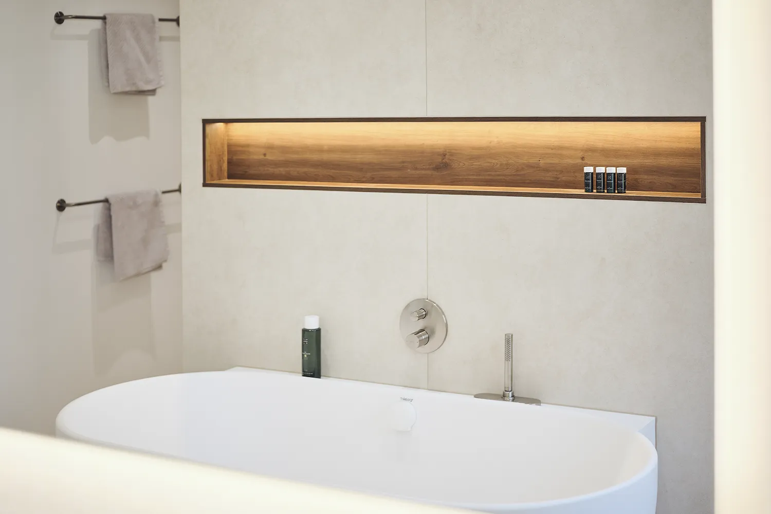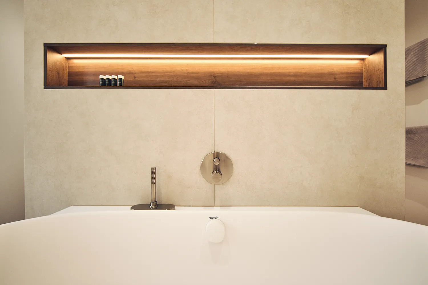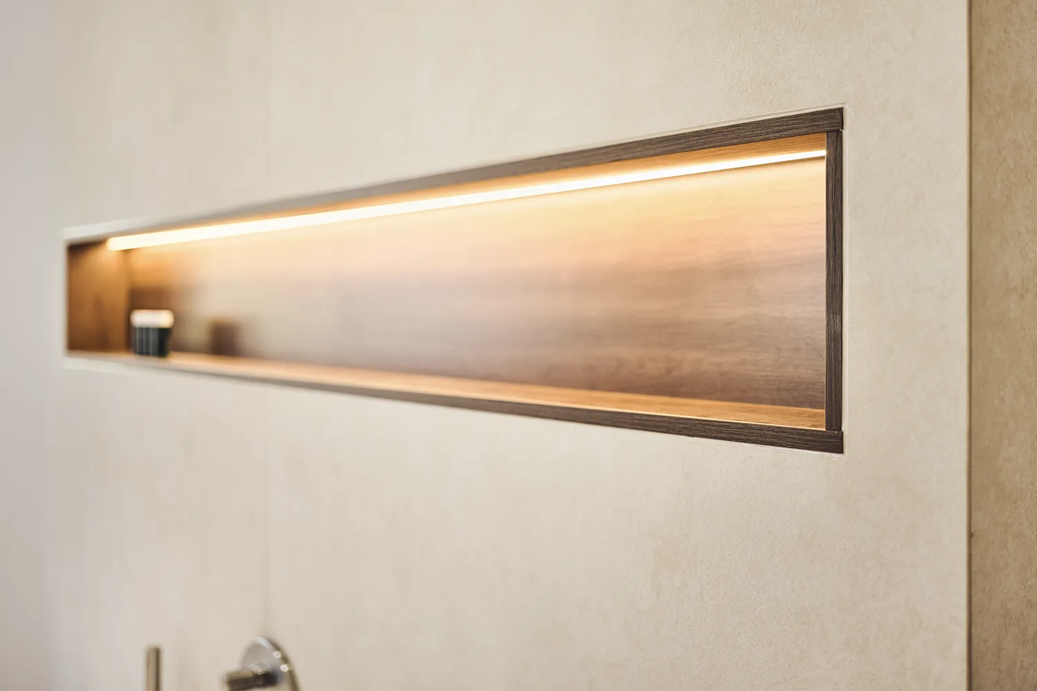 Über dem WC befindet sich eine Ablagenische im Stil der Waschtischunterschränke, die mit einem LED-Stripe beleuchtet wird. Ein Unterputzmodul mit Glasabdeckung, für WC-Papier und die Bürstengarnitur, sorgt für komfortable Ordnung.