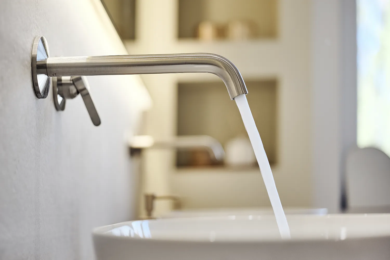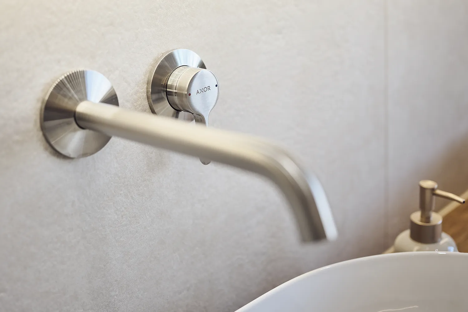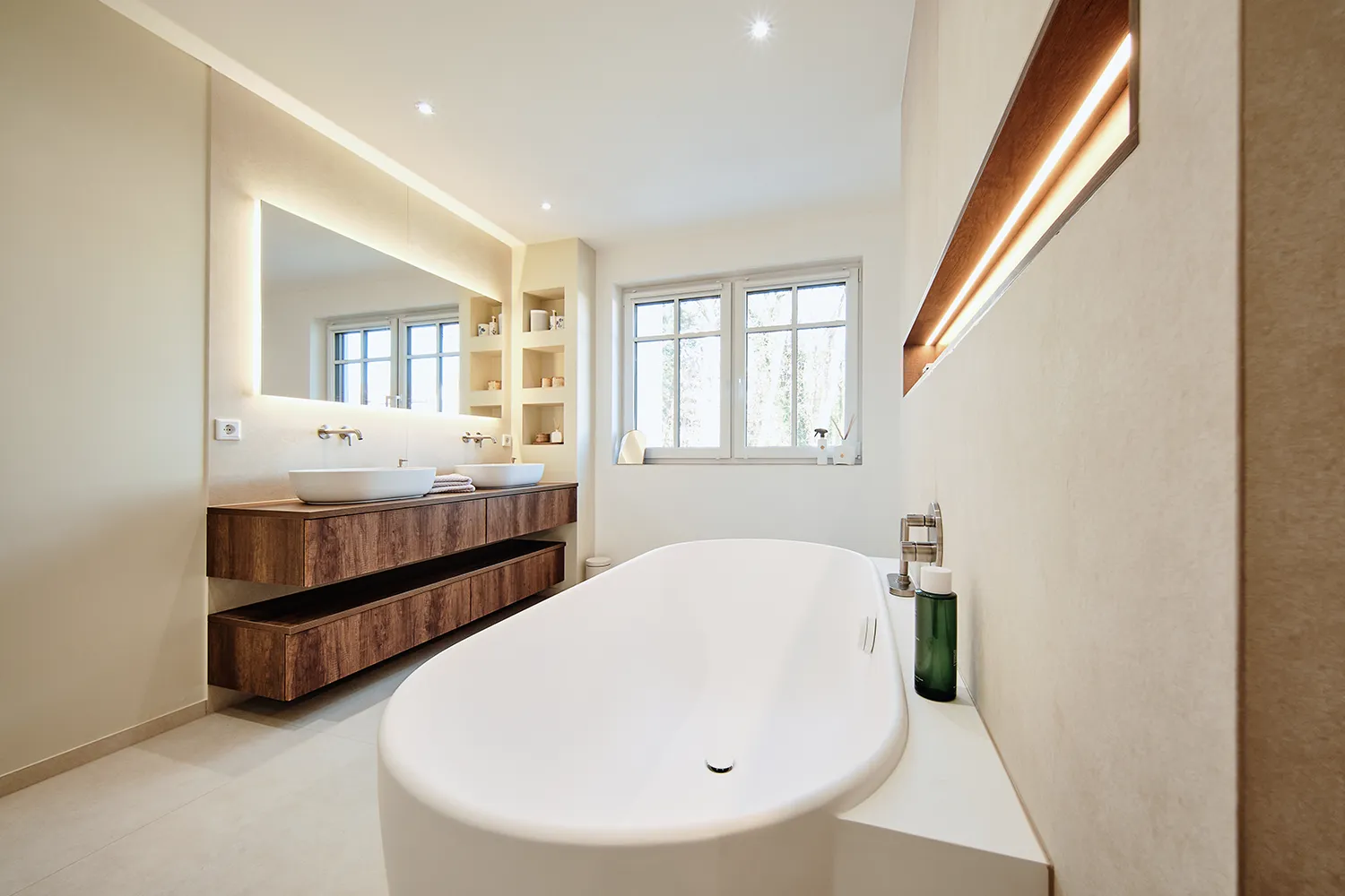 Für das Hauptbad im Obergeschoss wurde jedes Detail mit größter Sorgfalt ausgewählt. Eine große, halb freistehende Badewanne mit matter Oberfläche lädt zum Entspannen ein. Die bodengleiche Dusche mit Rainshower-Duschkopf und gefliester Nische garantiert ein behagliches Duscherlebnis. Alle Waschtische sind mit eleganten Armaturen ausgestattet. Große Fliesen, die raumhoch eingesetzt wurden, hinterlassen dank durchlaufender, senkrechter Fugen ein stimmiges Gesamtbild. Dieses wird durch flächenbündige Drückerplatten und das Unterputzmodul für Toilettenutensilien optimal unterstützt. Der großformatige Spiegel und die ausgeklügelte Beleuchtung sorgen für ein sehr stimmiges Ambiente in diesem modernen Baderaum.