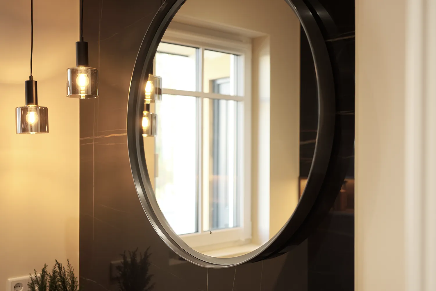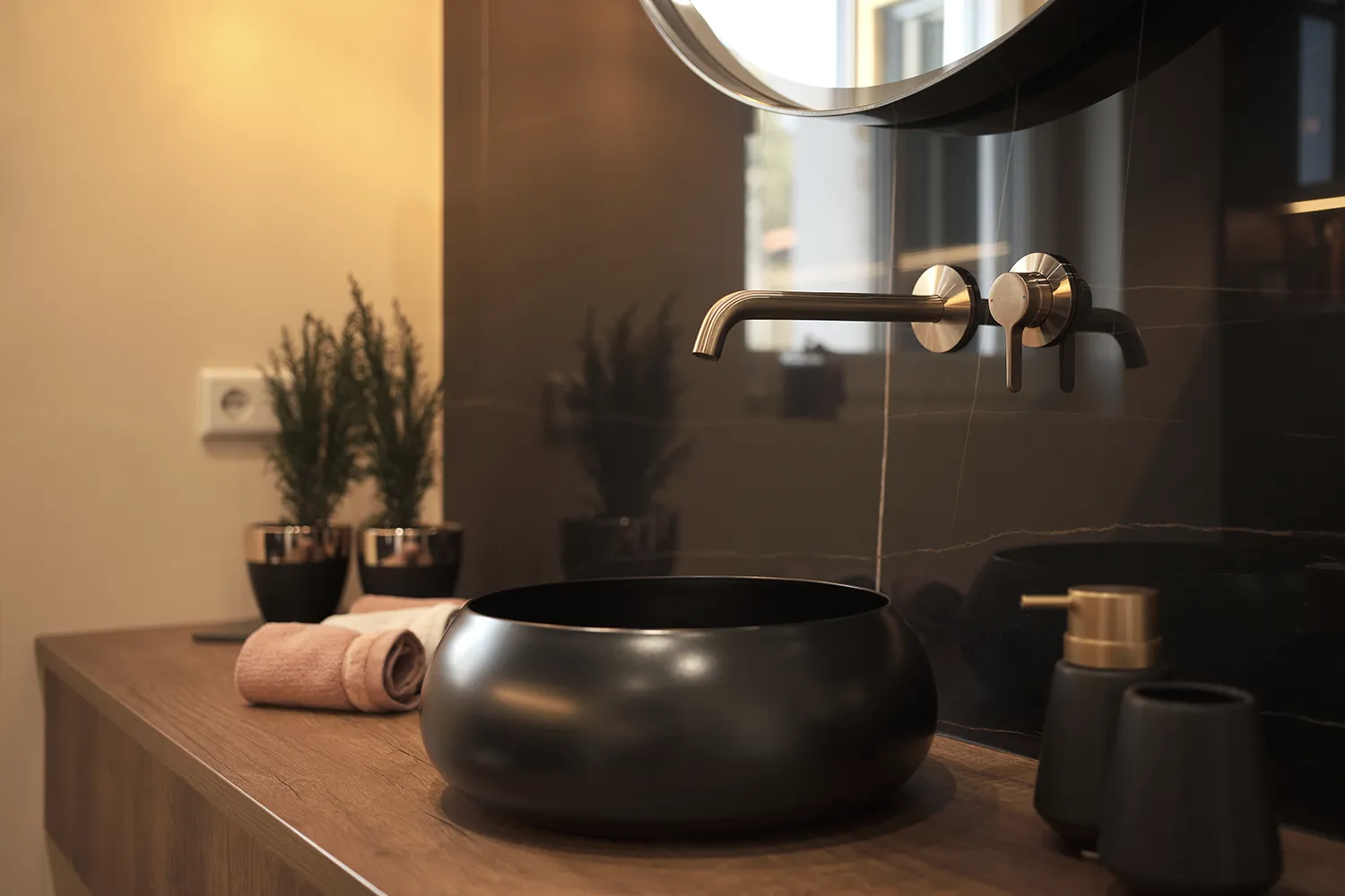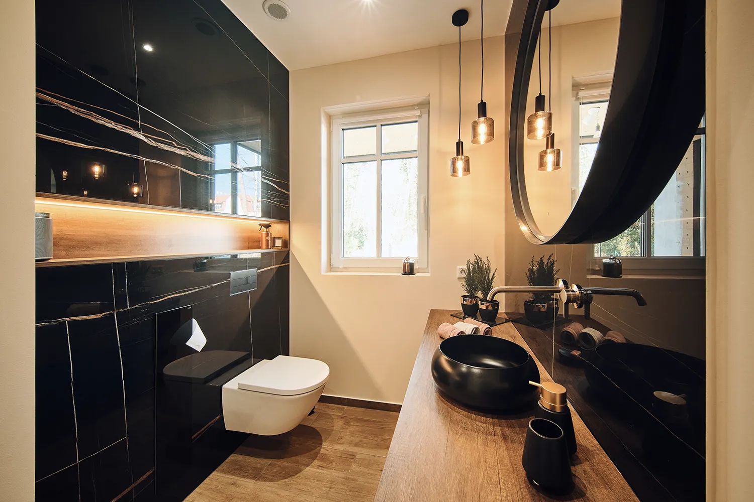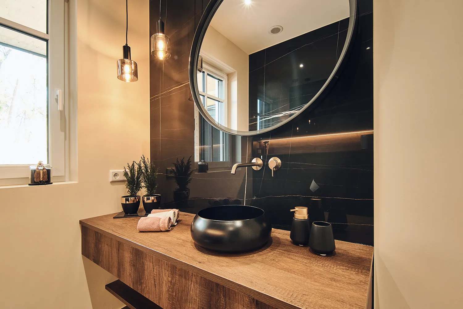 Das Gästebad zeichnet sich durch großformatige, fugenfreie Fliesen aus, welche eine moderne und besondere Optik erzeugen. Holzfliesen in Parkett-Optik verleihen dem Raum zusätzlich eine warme Atmosphäre. Die Möbel in Eiche passen perfekt zu den schwarzen Waschtischen und den edlen Armaturen in Brushed Gold.